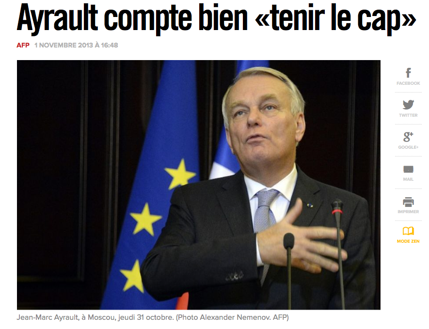 AyraultRegardez bien cette gueule de raie mal décongelée, ce visage avachi, ces cheveux jaune filasse, cette bouche molle, ce regard vitreux. Regardez bien ce pantin à l’ allure falote et au charisme de mollusque chez qui tout exprime l’ absence de personnalité. Regardez-le s’ accrocher à cet élément de langage  » tenir le cap », alors que toute son action depuis mai 2012 est de tirer des bords carrés et de se renier tout en se faisant piétiner par ses ministres.  » Je louvoie pour vous  » serait une devise plus appropriée, mais on lui a dit que  » tenir le cap » faisait plus capitaine dans la tempête. Tout est ridicule chez lui, son allure de guichetier de la société générale nantaise, sa gestuelle quand il brandit ses mains molles, mais surtout, surtout, son action au poste de premier ministre, dont il aura déshonoré la fonction pour longtemps. Encore aujourd’hui il vient de se ridiculiser auprès de Medvedev. ICI