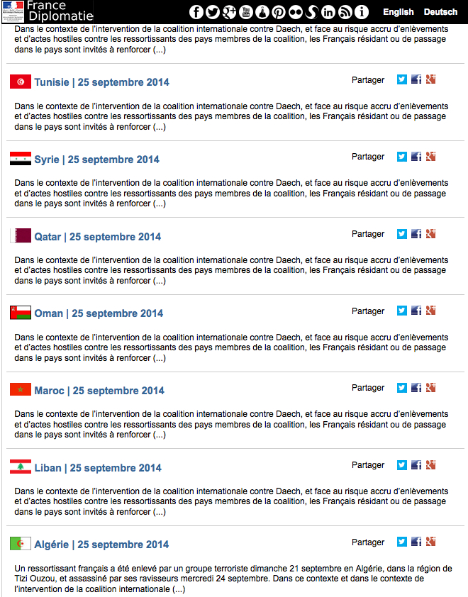 La liste des pays définis comme  » à risques  » par le ministère des affaires étrangères ( consultable dans la rubrique dernières minutes ), ne cesse de s’ agrandir. Ils sont repérés par le petit texte suivant: