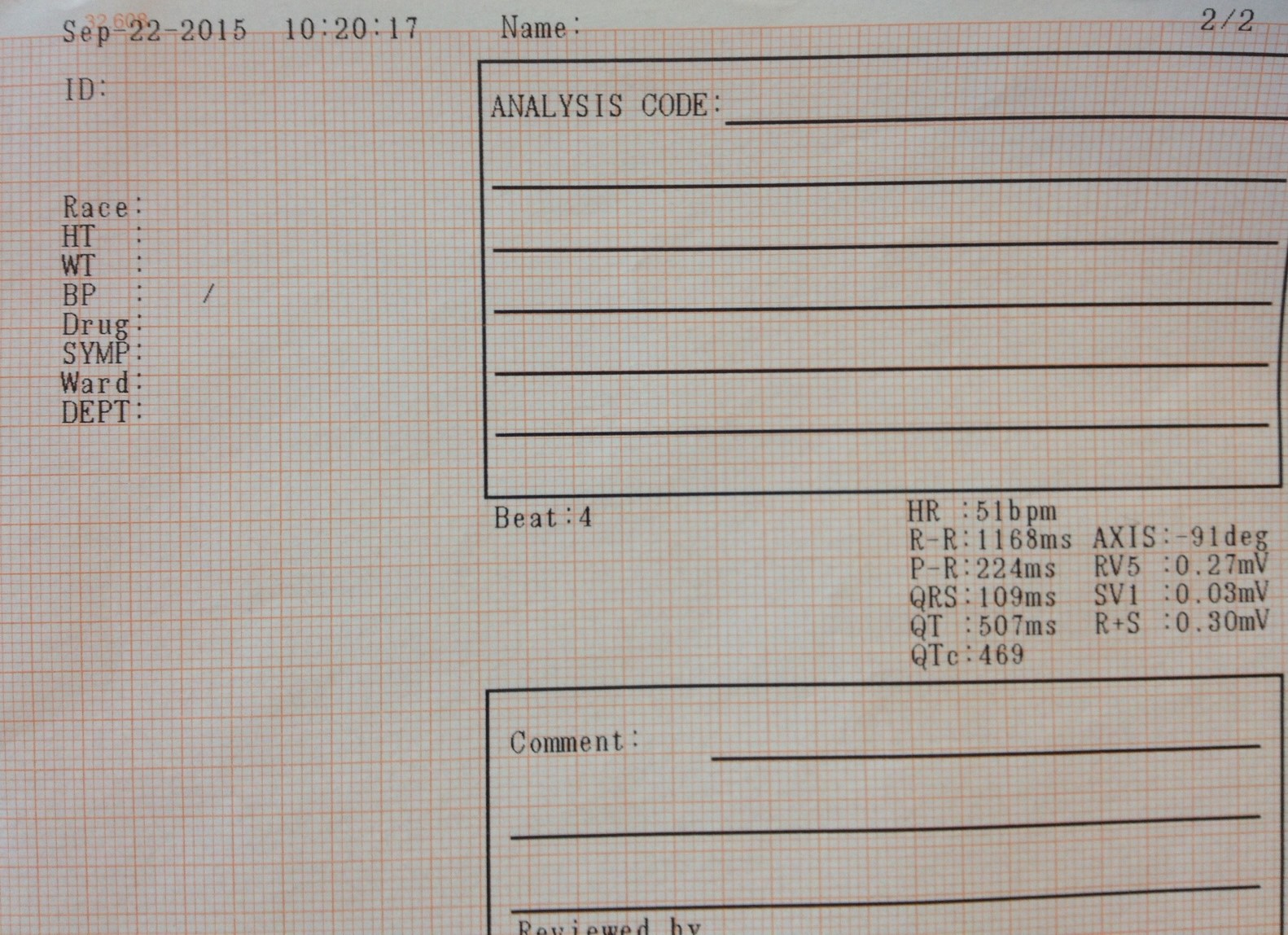 Je regarde un ECG qui traine sur mon bureau. La fin de l’ enregistrement, en anglais, est toujours sur le même modèle. Deux encarts avec des lignes, intitulés « Analysis code » et « Comment », un récapitulatif (sur la droite) des principales mesures utiles: PR, QRS, QT, etc, …