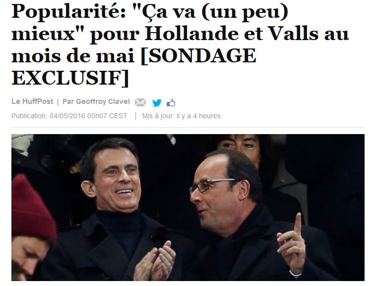 La confirmation  dans la remontée sondagière de mou président. Il faut dire que les merdiques médias ont mis le paquet: augmentation phénoménale de la croissance, bien plus importante que prévue (0.5 au lieu de 0.4), baisse massive du chômage, contrats miraculeux de vente de sous-marins, classement de Hollande parmi les dirigeants les plus influents de l’Univers, etc, etc, … Ah, il n’ont pas ménagé leurs efforts pour conforter le message du « ça va mieux ». Ils ont raison puisque cela marche, les deux pèbres remontant dans les sondages: