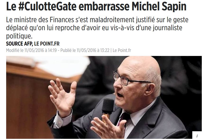Capture 2Le meilleur en ce moment, c’ est le gros Sapin. Vous savez, le pervers à tête de nœud qui est soi-disant ministre de l’économie, avec les résultats spectaculaires que l’ on connait. Le gros Sapin donc, vient de reconnaitre ce qu’ il avait d’ abord nié, et renonce à porter plainte pour diffamation. Mais il ouvre quand même sa gueule, dit qu’ il regrette, qu’ il a pas vraiment touché la culotte, mais un peu tripoté le bas du dos, que c’ est pas bien mais qu’ il s’ est excusé (pas de son initiative, d’ ailleurs: lire ICI).